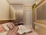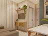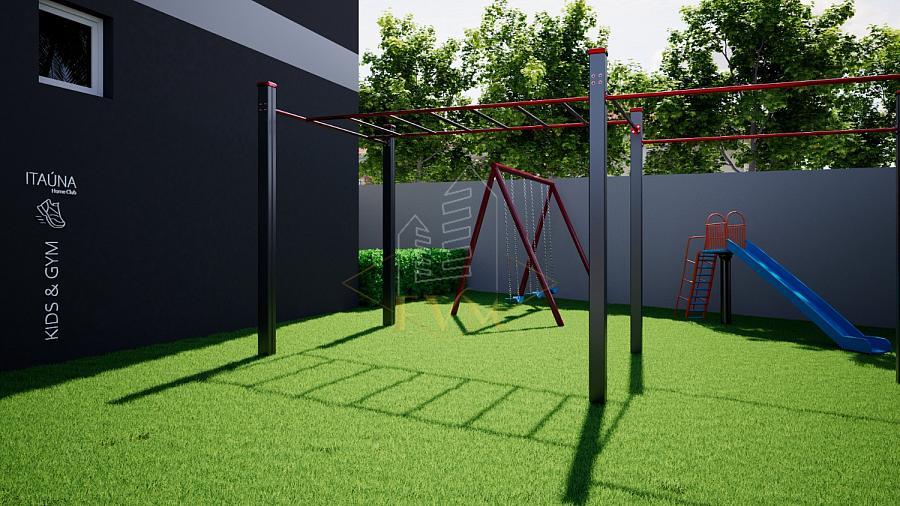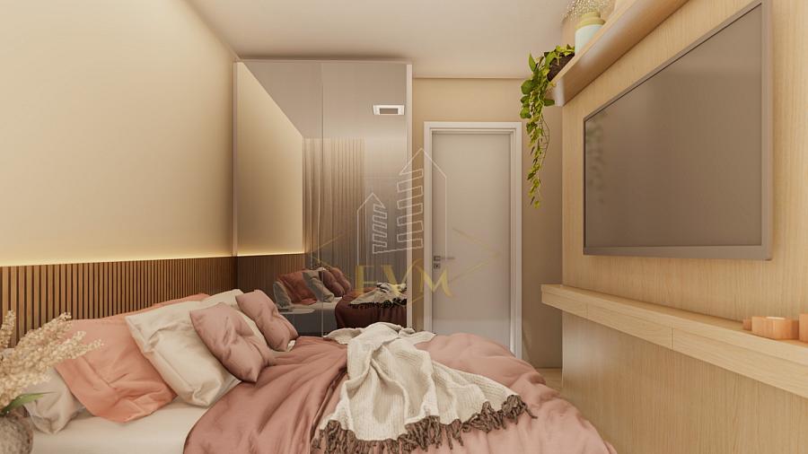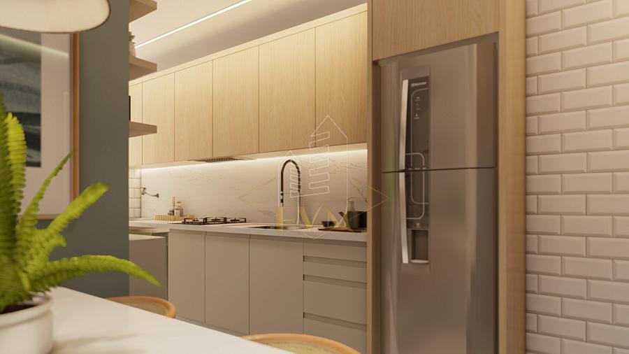 46m² a 47m² privativos, com 2 quartos, 2 banheiros e sacada com churrasqueira.